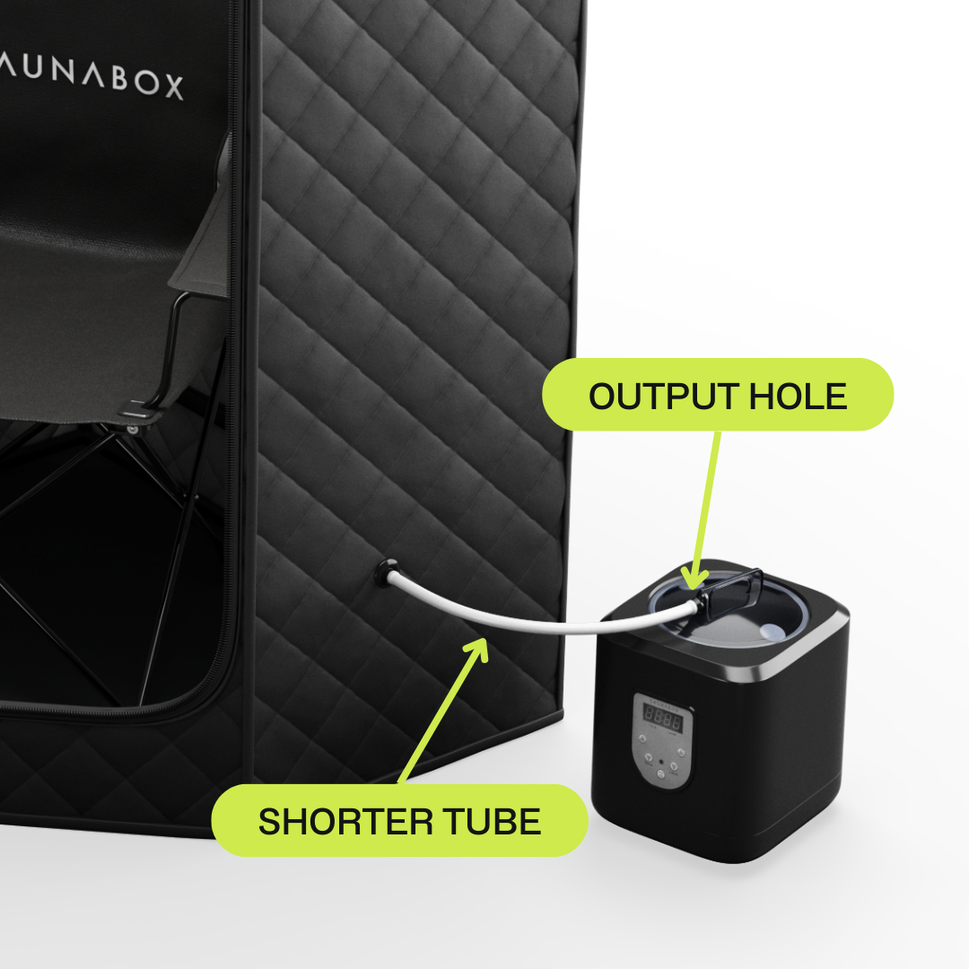 (10) Assemble the SmartSteam unit: Attach the SHORTER tube to the output hole on the lid. Then, attached the end of the tube to the SaunaBox connector.